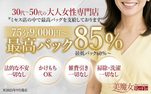 若い女性にはない大人の艶を兼ね備えた美魔女のみを採用したメンズエステ「美魔女refle」 セラピストのルックス、会話、施術のどれをとっても圧倒的なハイクオリティでお客様をお出迎えさせて頂きます。 記憶に残る素敵なお時間をお過ごし下さいませ。